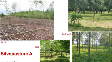 Silvopasture A. Our first attempt at silvopasture started in 2007. Wwe fallowed about 5 acres, allowing trees to regenerate naturally, while restricting livestock access for about 4 years. Then we released the "goat mob" to manage the overgrowth. Once the goats cleared some space for human access, we conducted a prescribed thinning to select for any beneficial species that survived the goat chaos. The result was a mixed pine and poplar silvpasture. We wanted oaks... but alas the goats ate them.